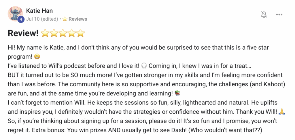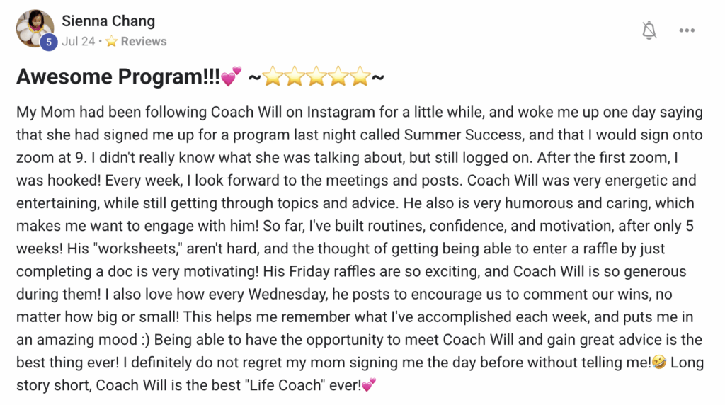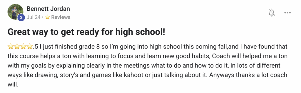 93% of students, even the most reluctant at first, end up LOVING the sessions! It’s relatable advice from someone NOT names Mom and Dad. Plus, I give out LOTS of money and gamify it to keep them engaged! If they don’t like it, within 15 days of enrolling, I’ll give you your money back! Zero Risk, VERY high reward.